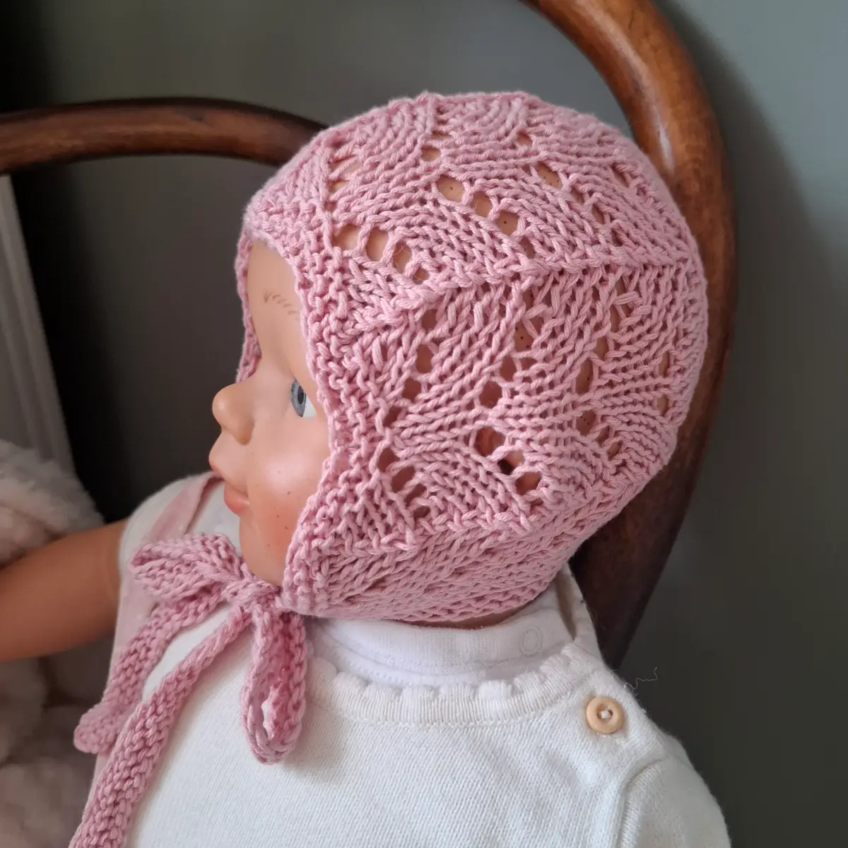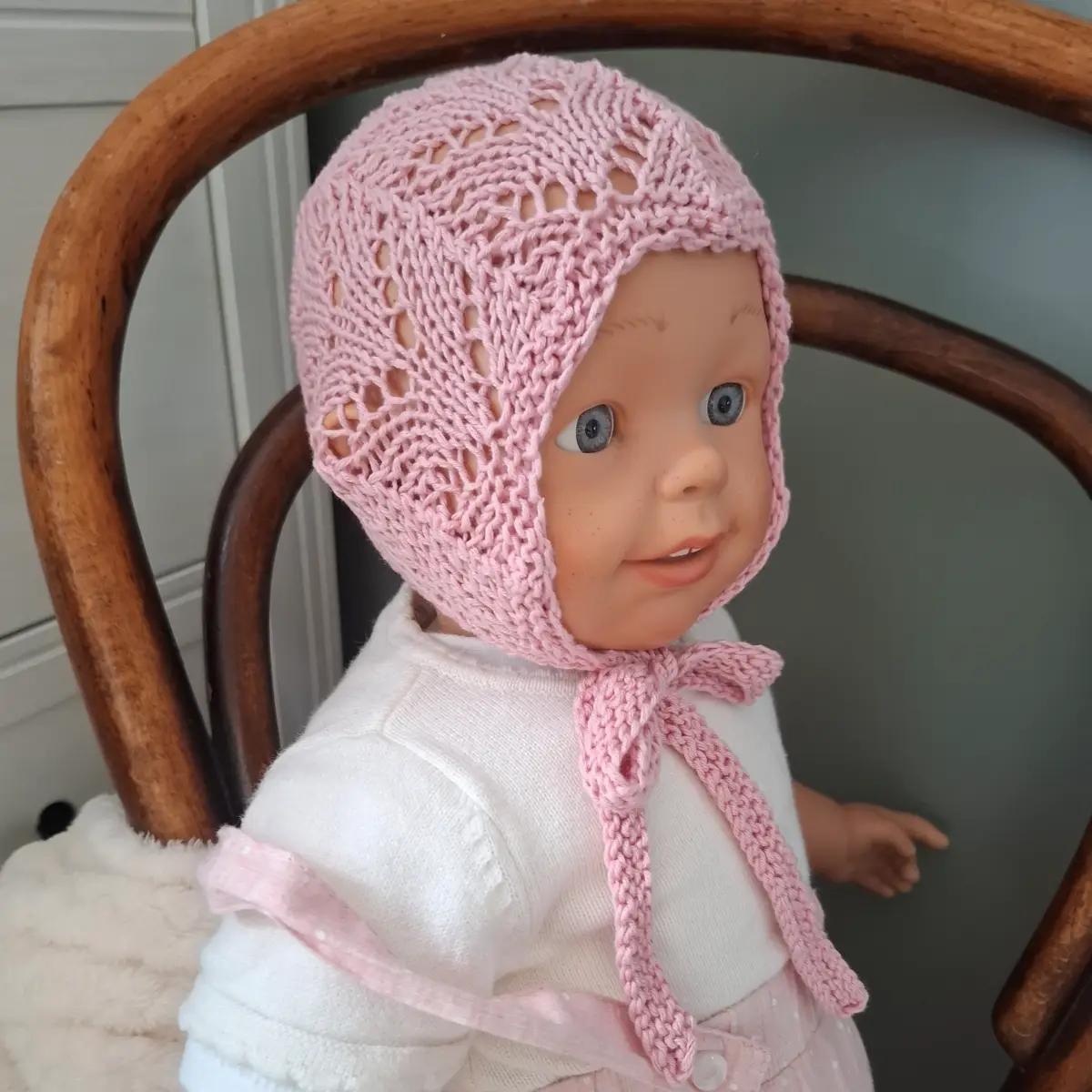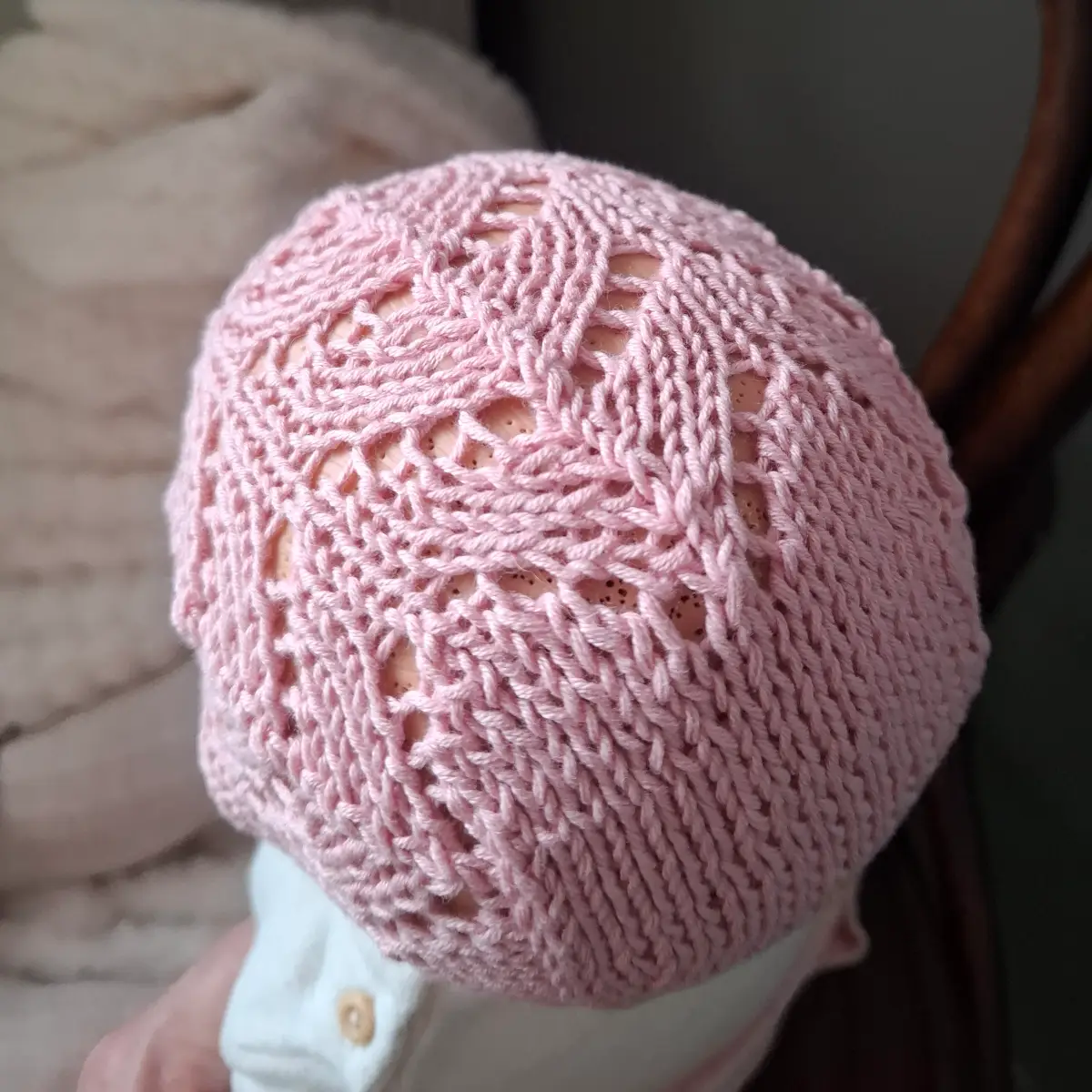 Czapka wykonana ręcznie z egipskiej bawełny bardzo przyjemnej i miłej w dotyku, przeznaczonej na wyroby dla dzieci. Idealna na sezon wiosna/lato. Dokładnie przylega do główki dziecka. Jest wykonana bezszwowo, nigdzie nie uciska główki. Ozdobiona ażurowym wzorem.