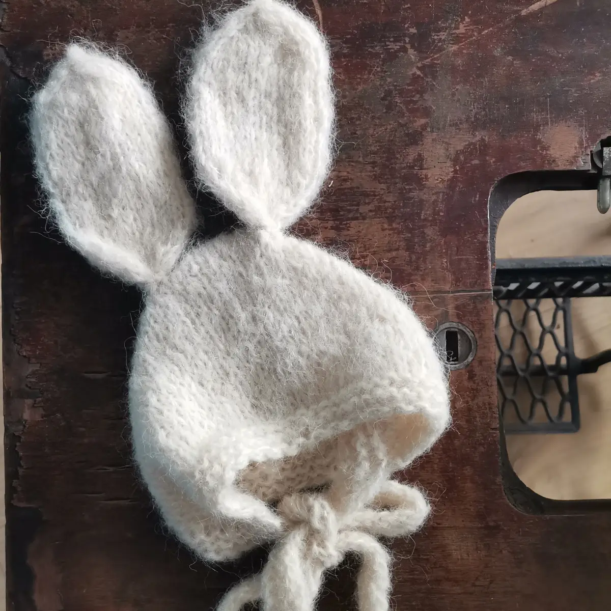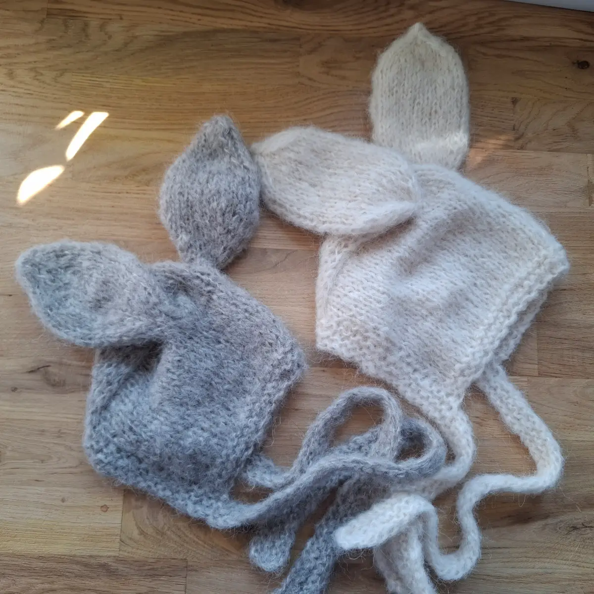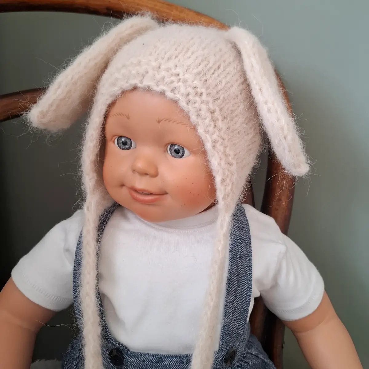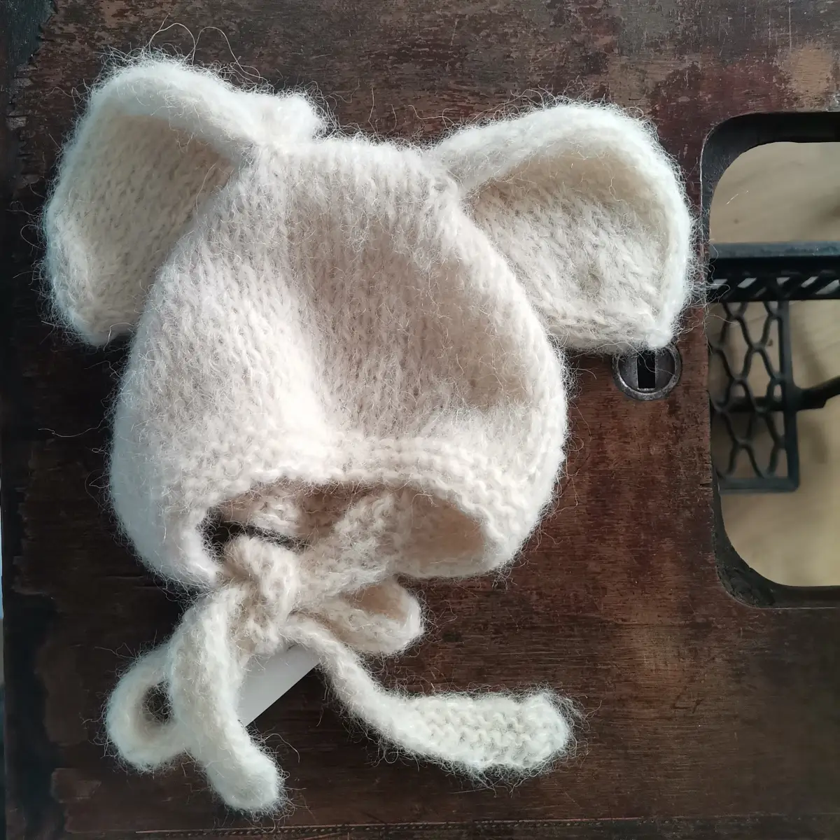 Czapeczka królik zrobiona z włóczki z wełny alpaki oraz jedwabiu, kolor ecru.