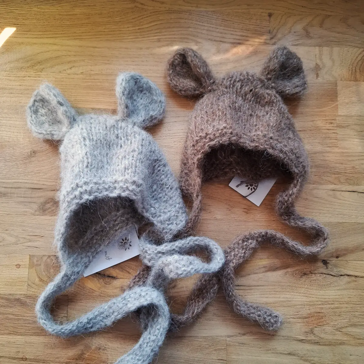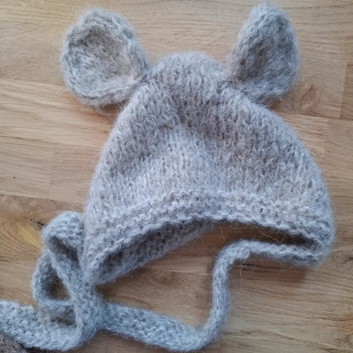 Czapeczka miś zrobiona z włóczki z wełny alpaki oraz jedwabiu, kolor szary, rozmiar 3-6 miesięcy.