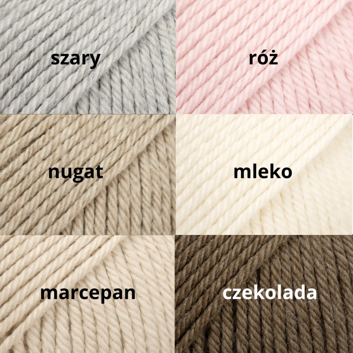 Rozmiar 1 – 3 lat, dostępny w 6 kolorach: mleko, marcepan, róż, szary, nugat i czekolada.
