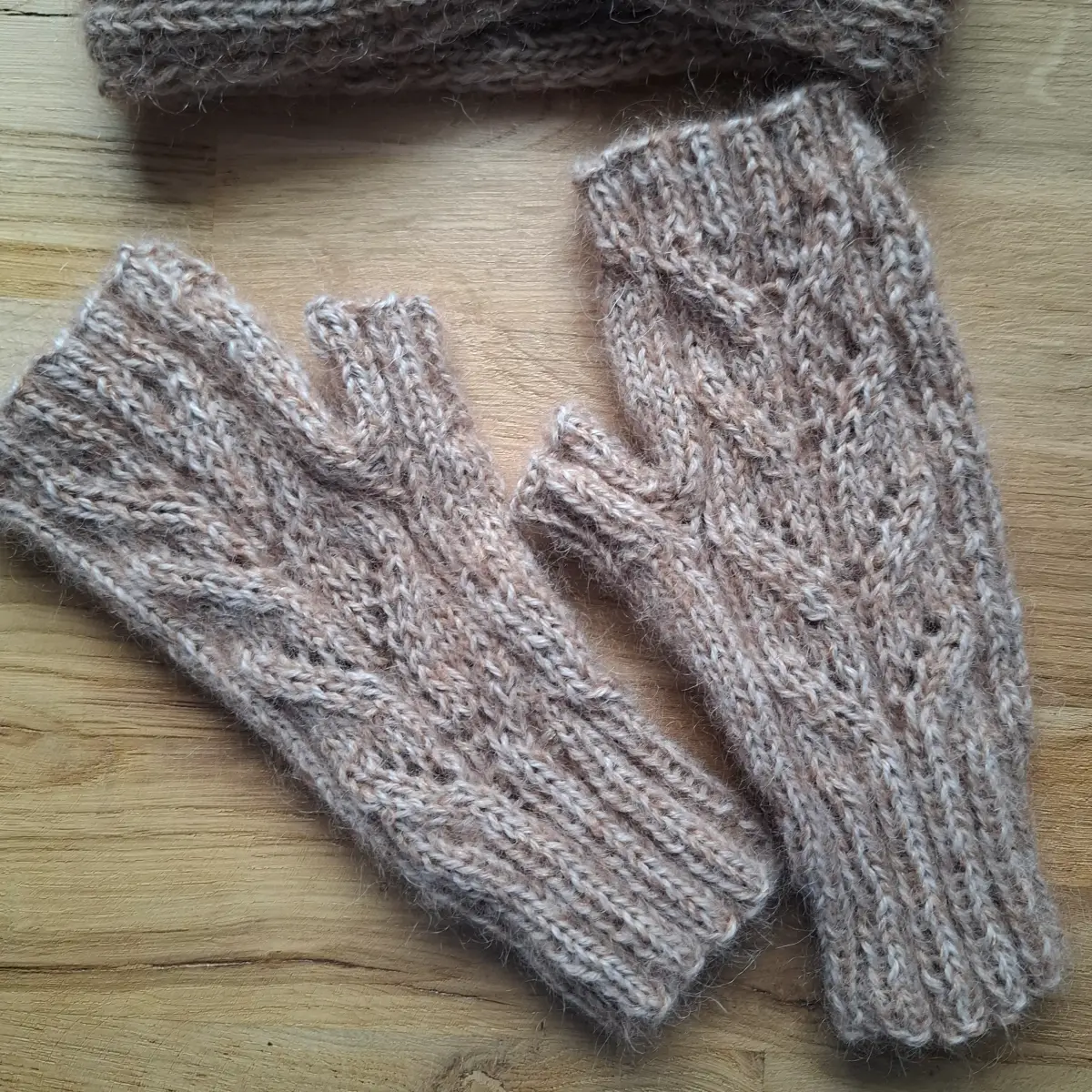 Mitenki damskie ażurowe wykonane z naturalnych włóczek wełnianych (71% alpaka, 22% kid moher, 7% jedwab). Połączenie włóczek dające miękkość i ciepło alpaki, delikatność jedwabiu oraz puszystość kid moheru . Mitenki ogrzeją dłonie w chłodne dni.