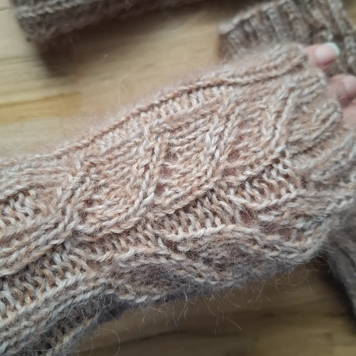 Mitenki damskie ażurowe wykonane ręcznie z  alpaki, delikatnego kid moheru i jedwabiu. Rozmiar uniwersalny, kolor karmelowy.