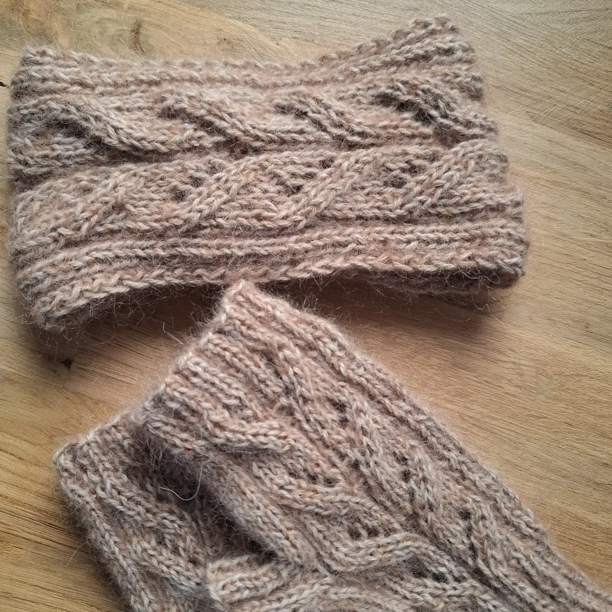 Opaska damska ażurowa wykonana z naturalnych włóczek wełnianych (71% alpaka, 22% kid moher, 7% jedwab). Połączenie włóczek dające miękkość i ciepło alpaki, delikatność jedwabiu oraz puszystość kid moheru . Opaska ogrzeje głowę w chłodne dni.