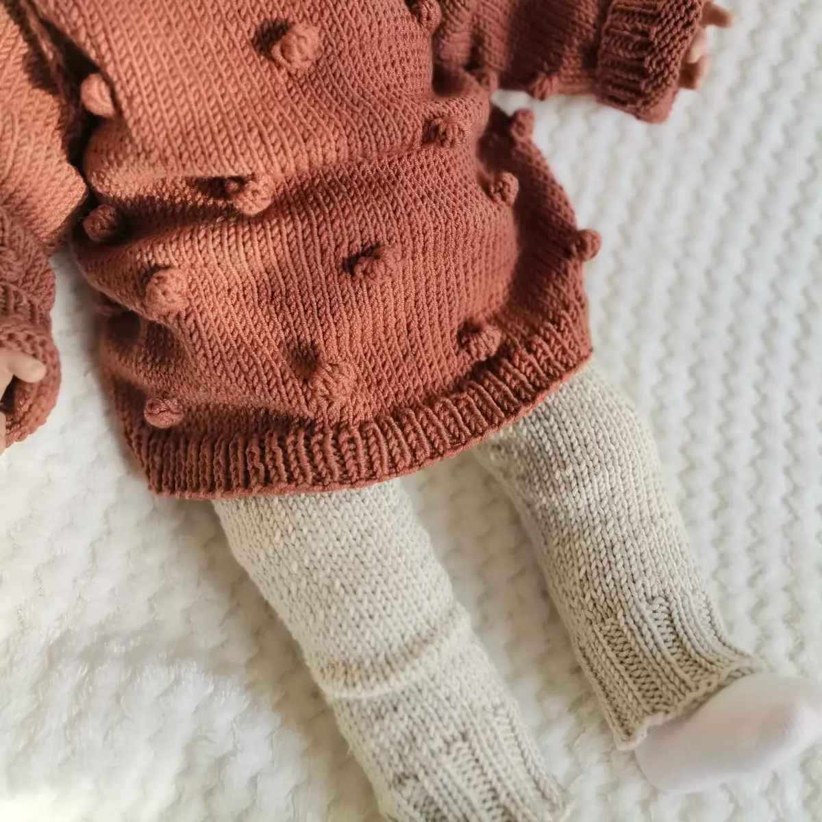Spodenki merino wykonane ręcznie z włóczki 100% merino. Miękkie i delikatne, bardzo miłe w dotyku. Rozmiar 62/68, kolor marcepan.