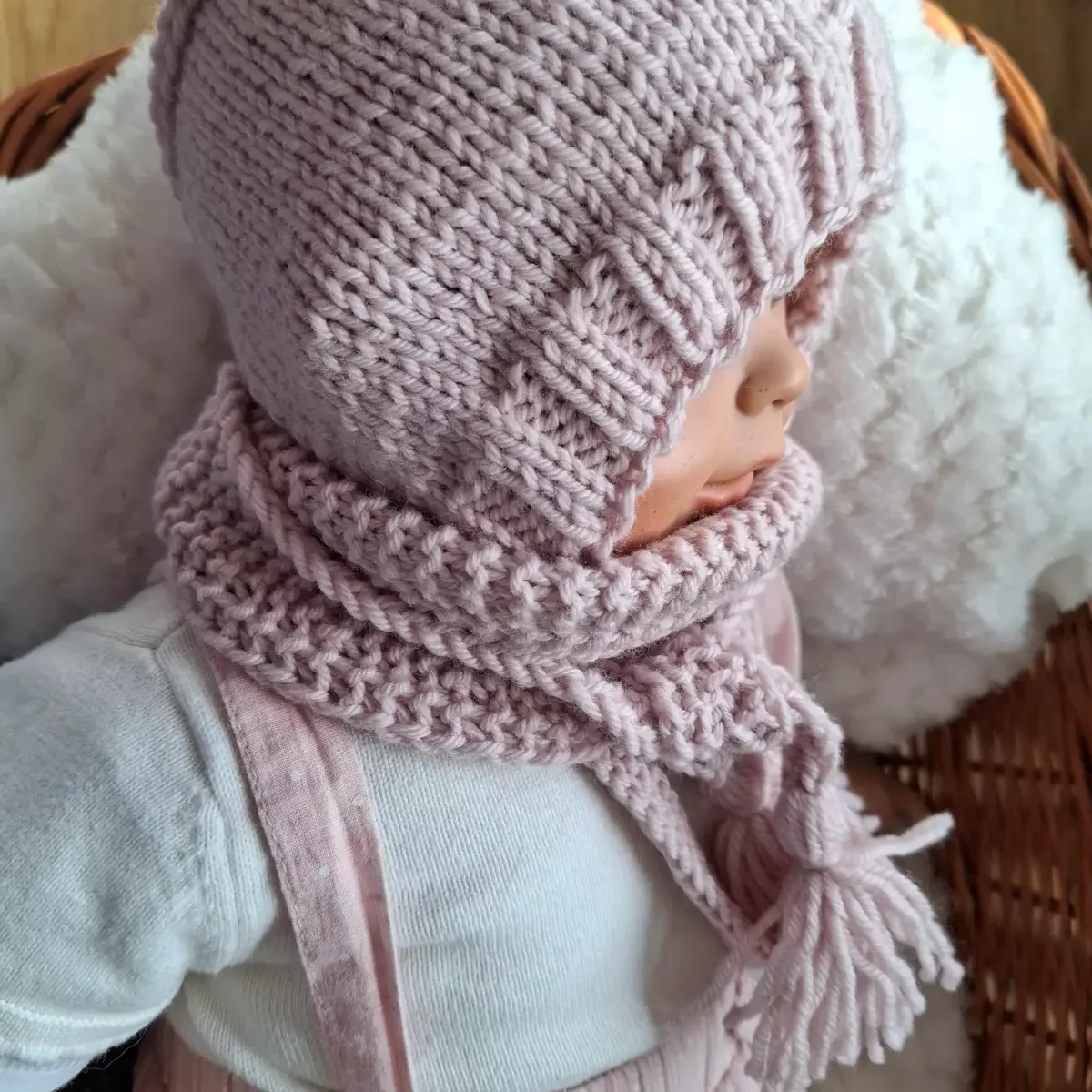 Zestaw czapka i szalik zrobiony z wełny merino, rozmiar 0-6 miesięcy, kolor różowy