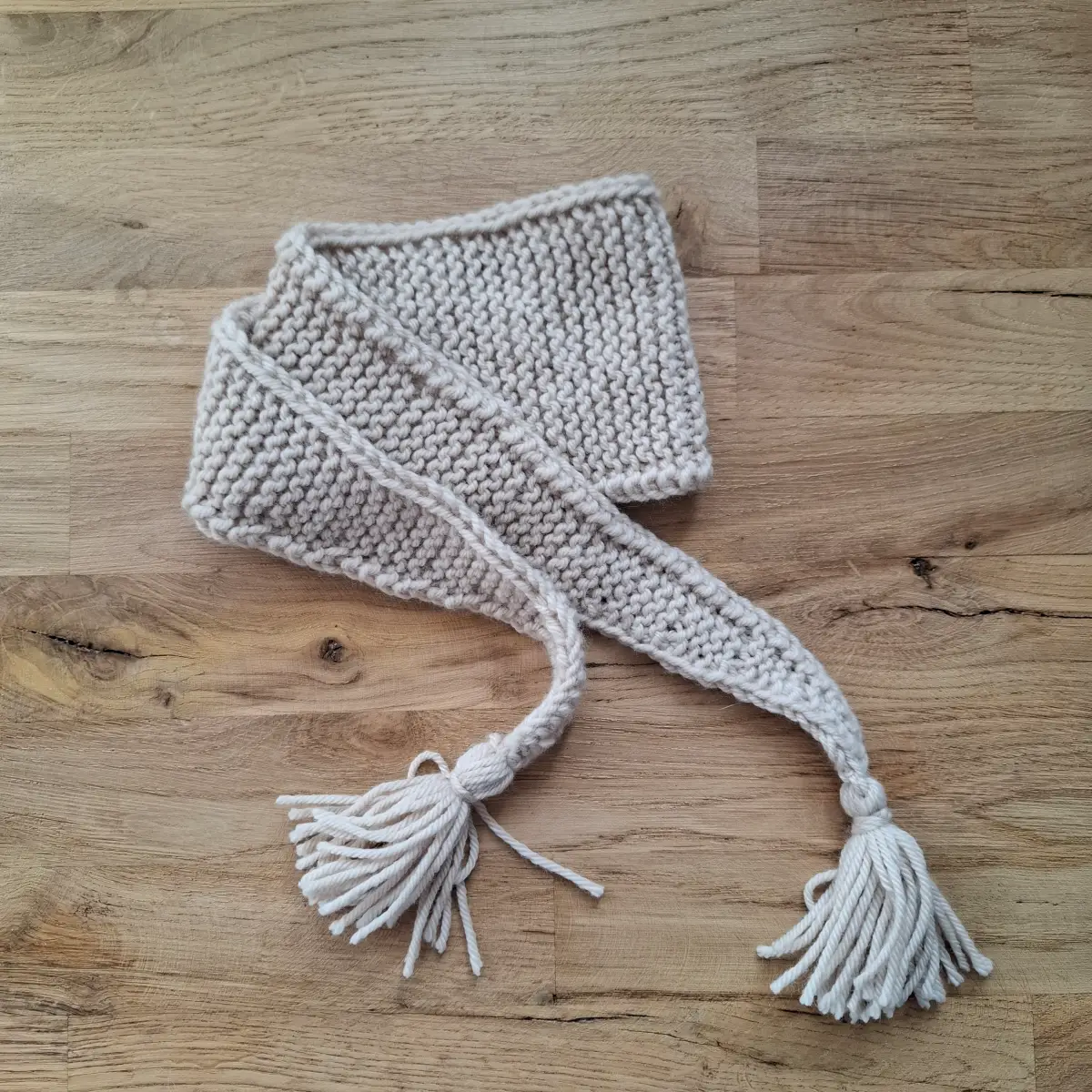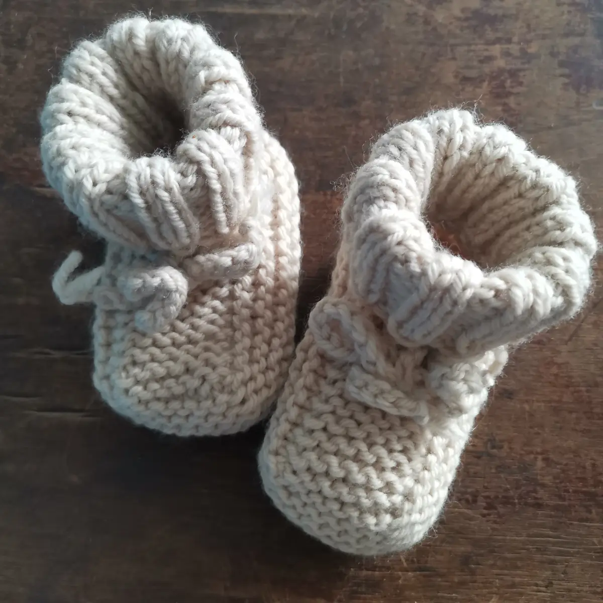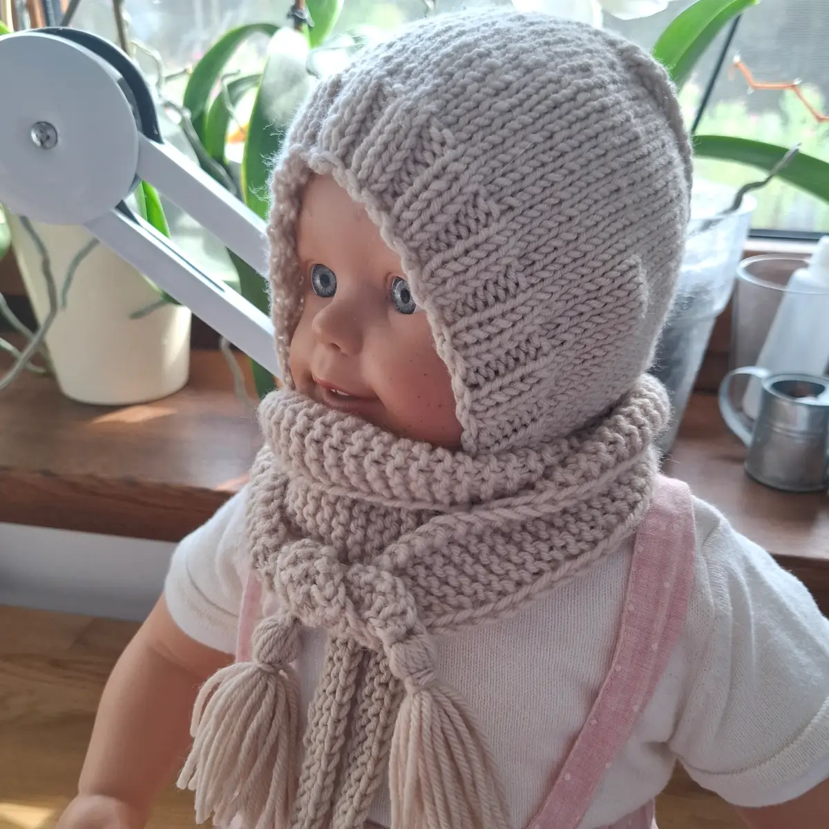 Zestaw niemowlęcy zrobiony ręcznie z wełny merino – czapka, szalik, rękawiczki, buciki. Rozmiar 0 – 6 miesięcy. Kolor marcepan.